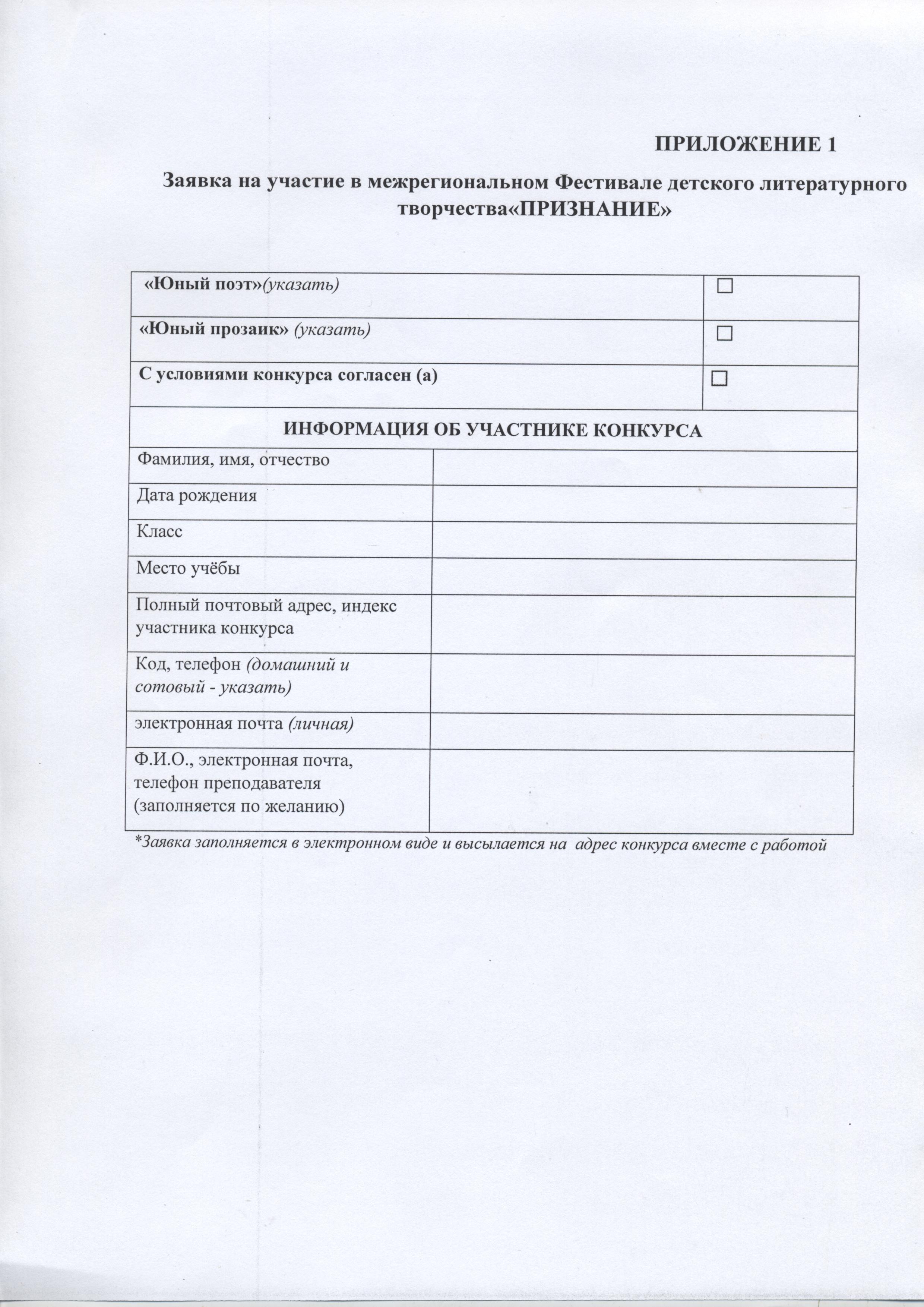 ПРИЛОЖЕНИЕ 1. Заявка на участие в Фестивале.