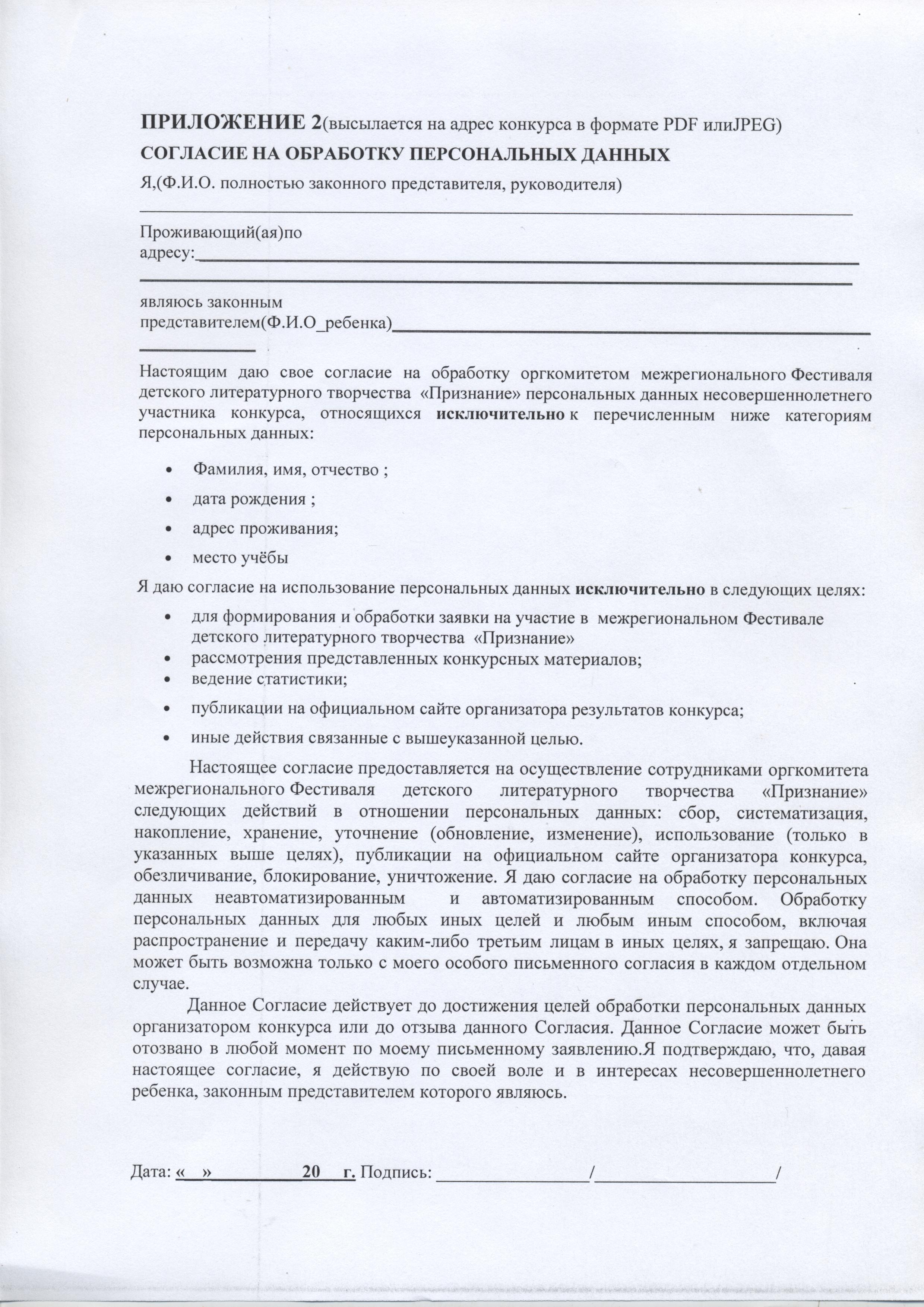ПРИЛОЖЕНИЕ 2. Согласие на обработку персональных данных.
